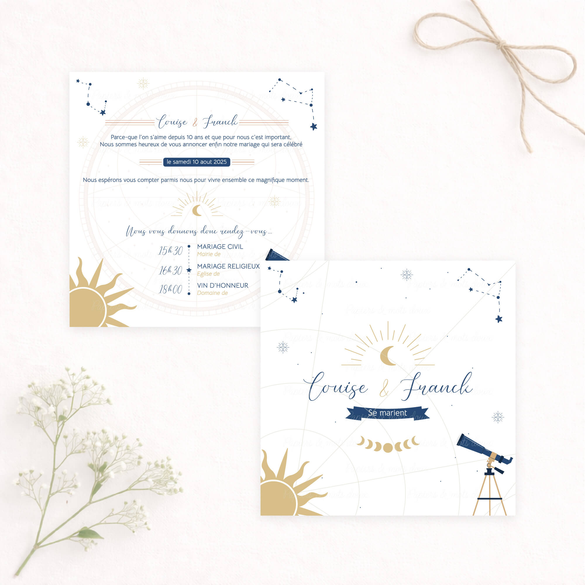 Rendez-vous sous les étoiles ! Une invitation sous le thème astral, lunaire et étoilée, avec ses typographies élégantes et raffinées avec ses touches de couleurs bleue nuit et beige.