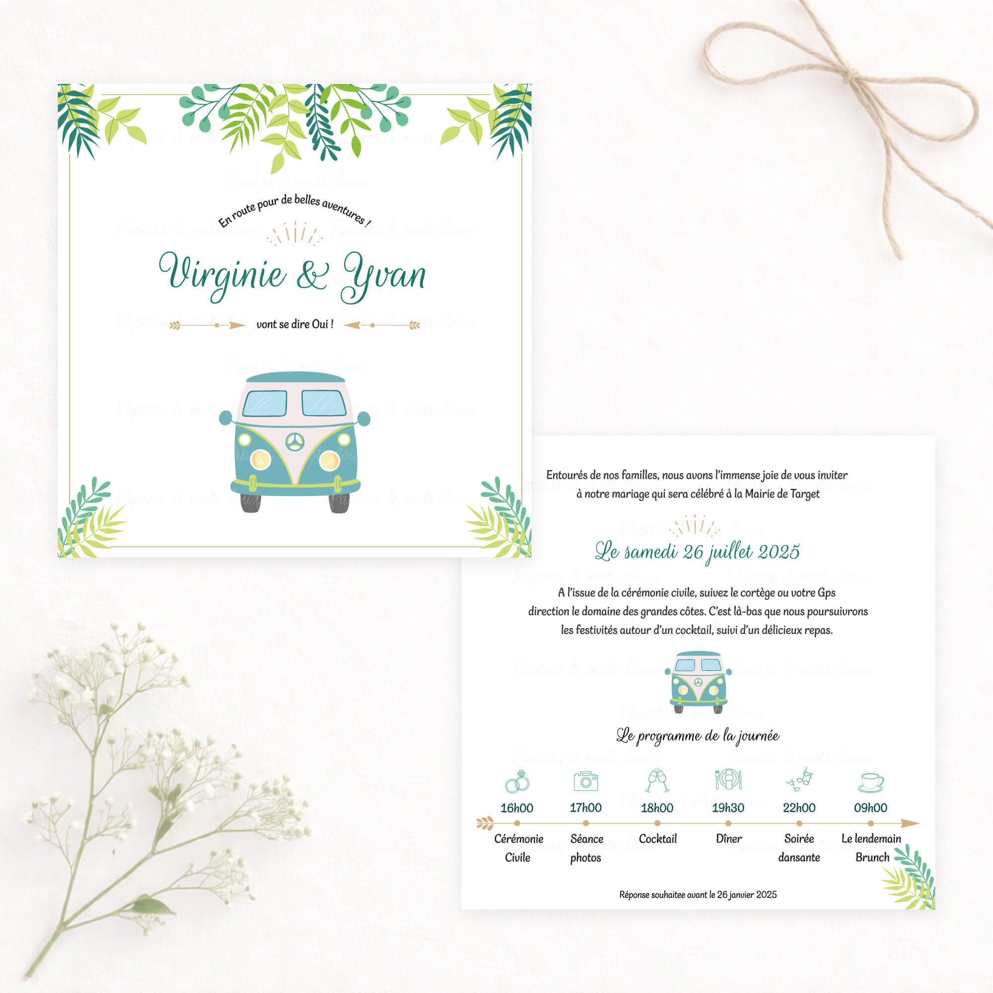 Découvrez notre faire-part de mariage « Combi Van », inspiré du mythique Combi Volkswagen et aux couleurs tendres.