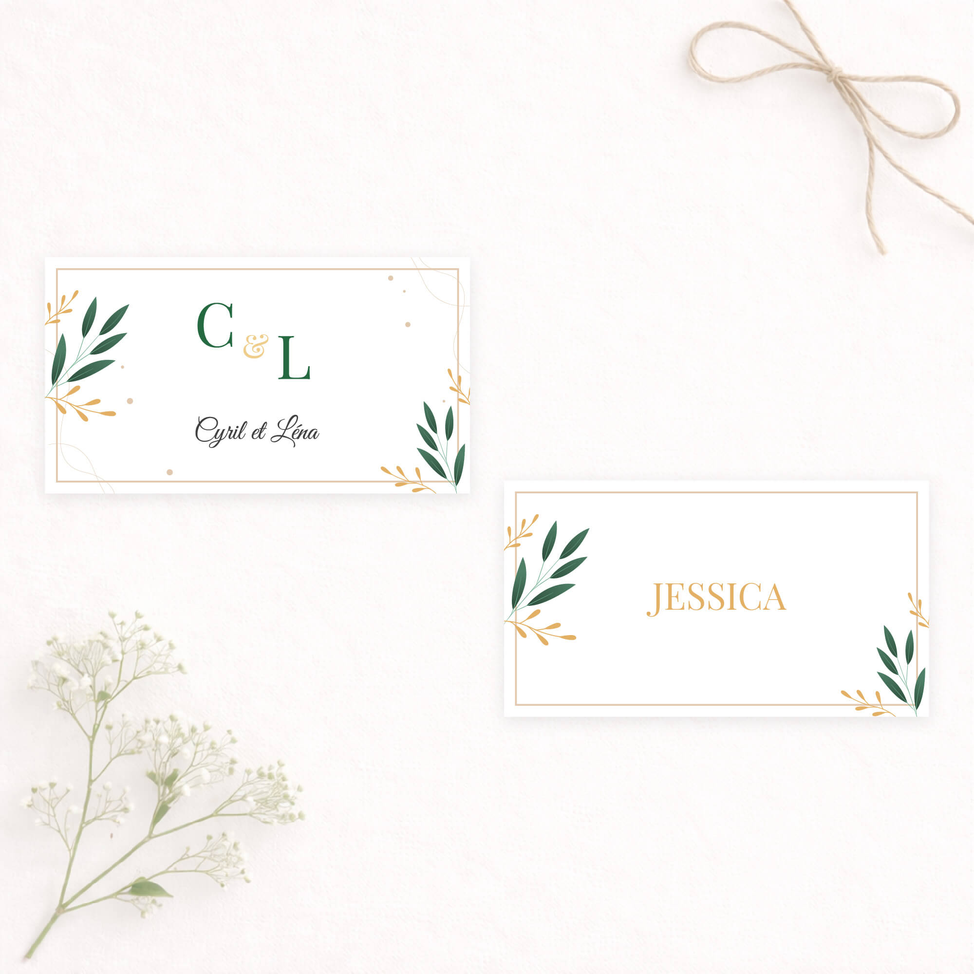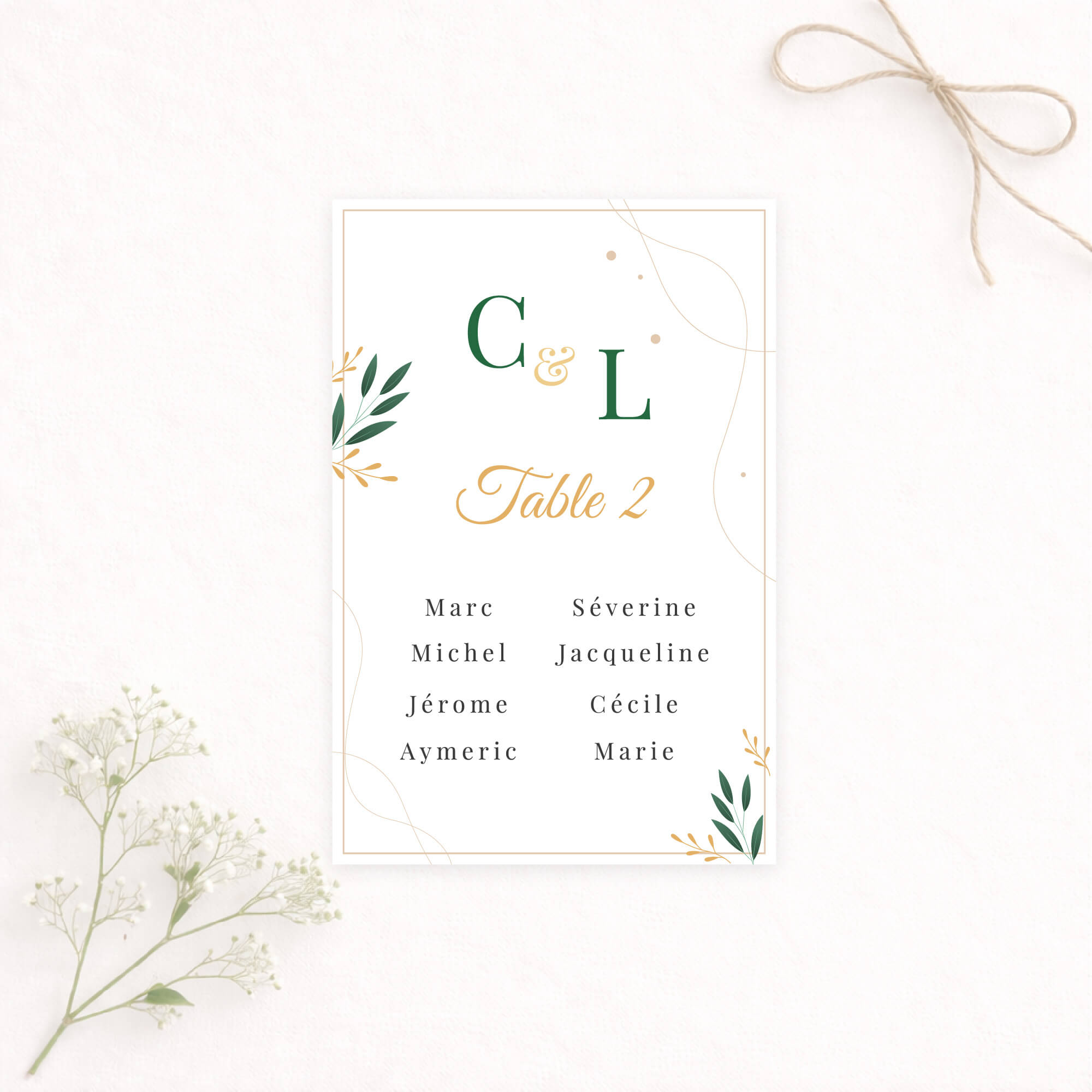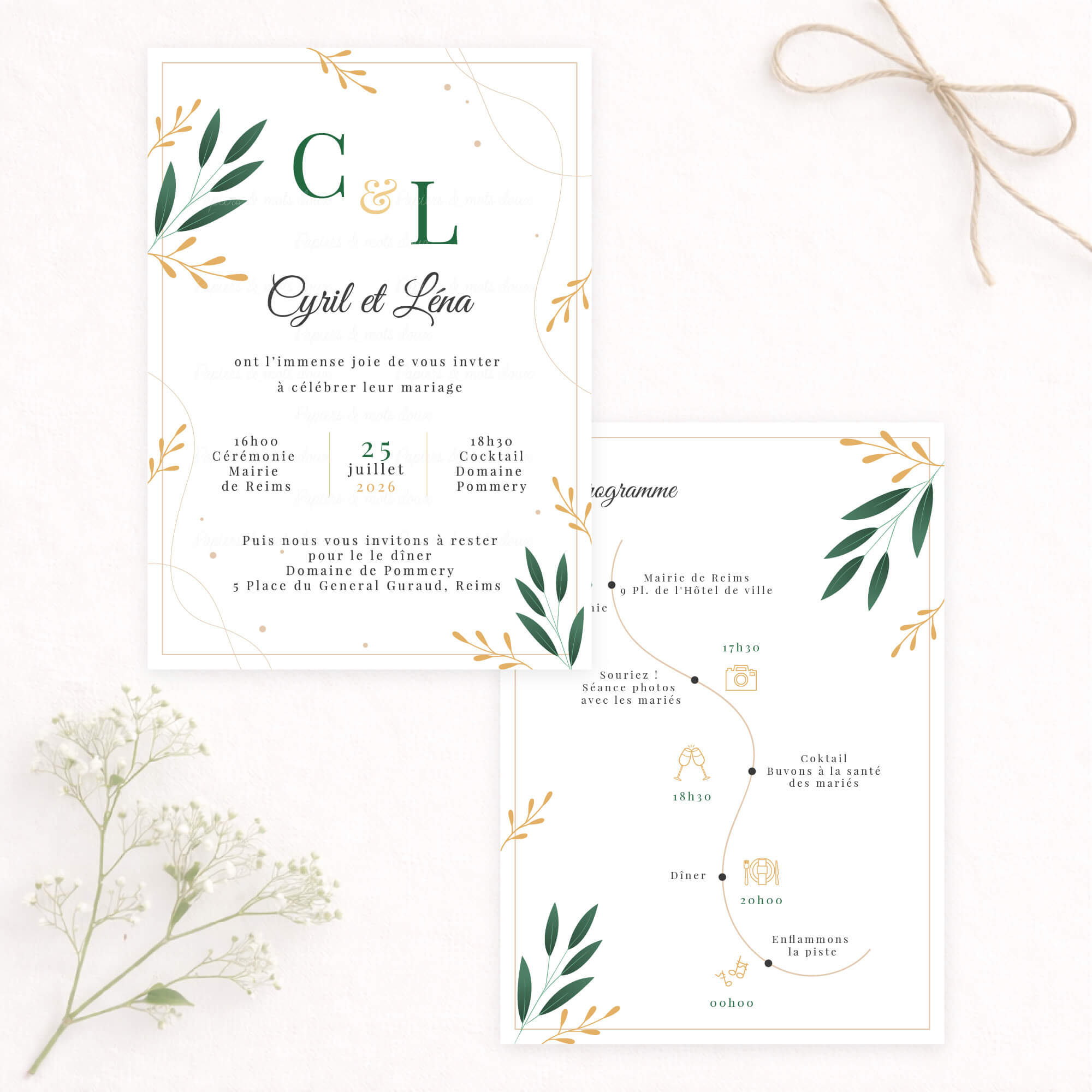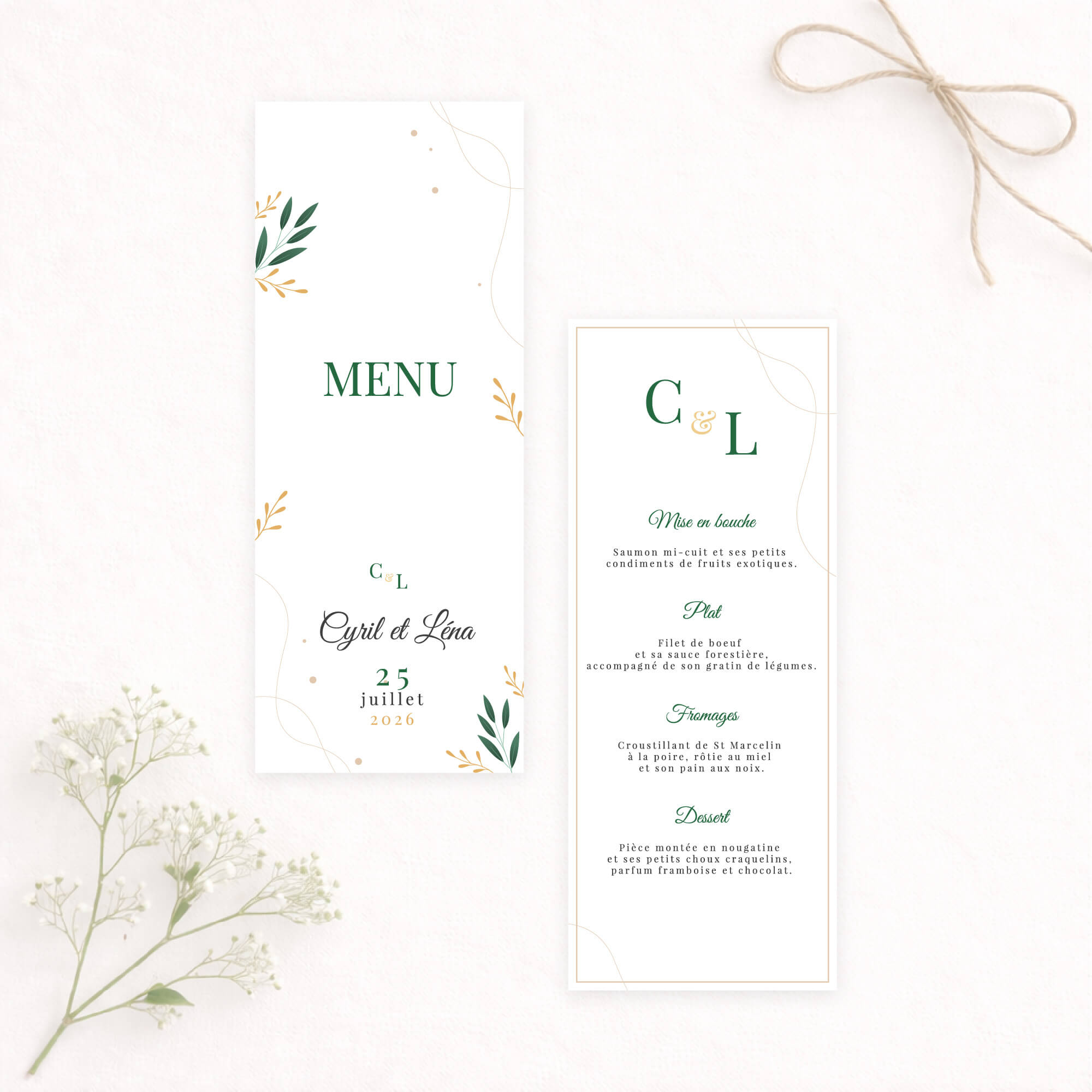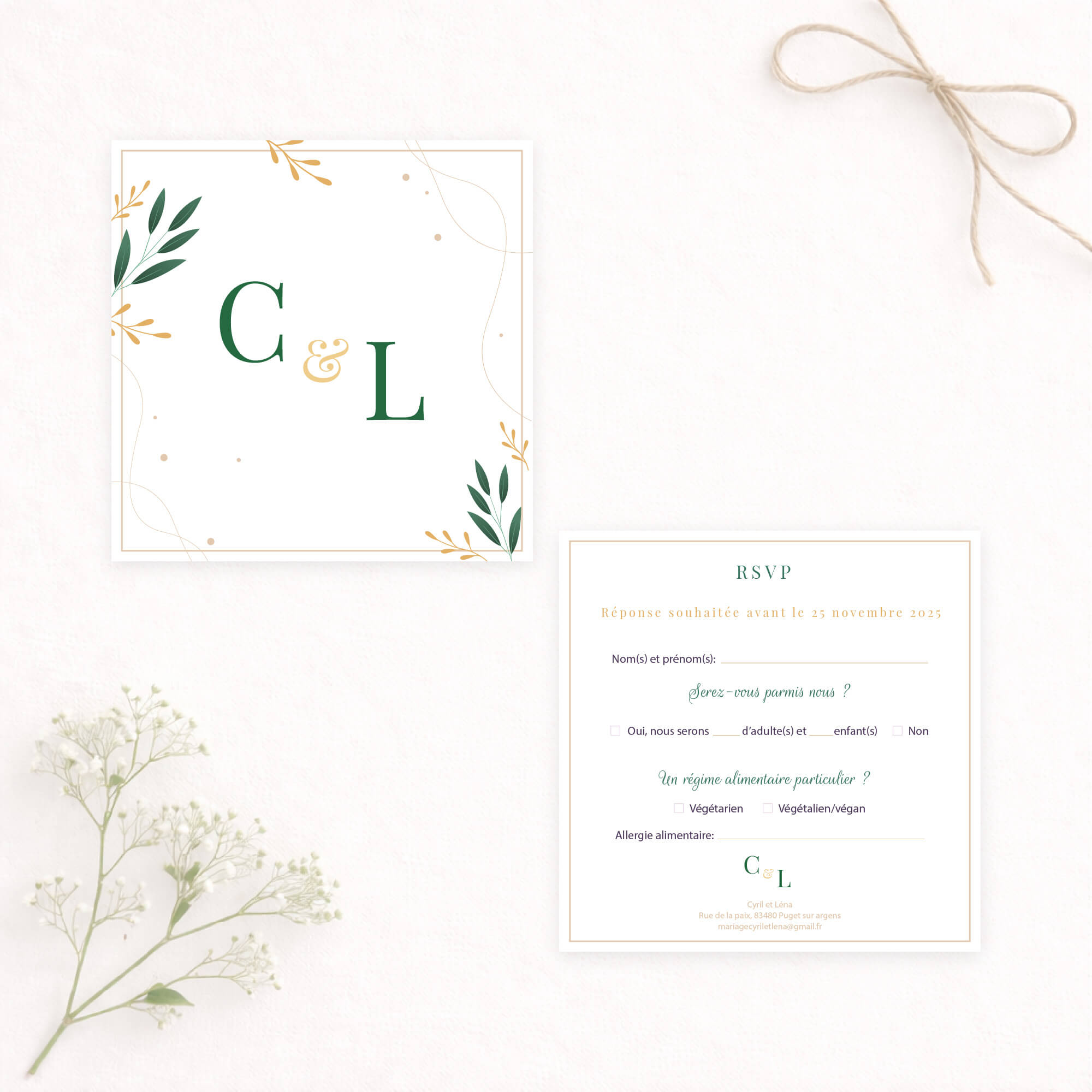 Un faire-part de mariage raffiné aux accents végétaux, mêlant une typographie élégante à de délicats feuillage. Les teintes vert émeraude et moutarde apportent une touche à la fois chic et chaleureuse, idéale pour annoncer votre union avec douceur et distinction.